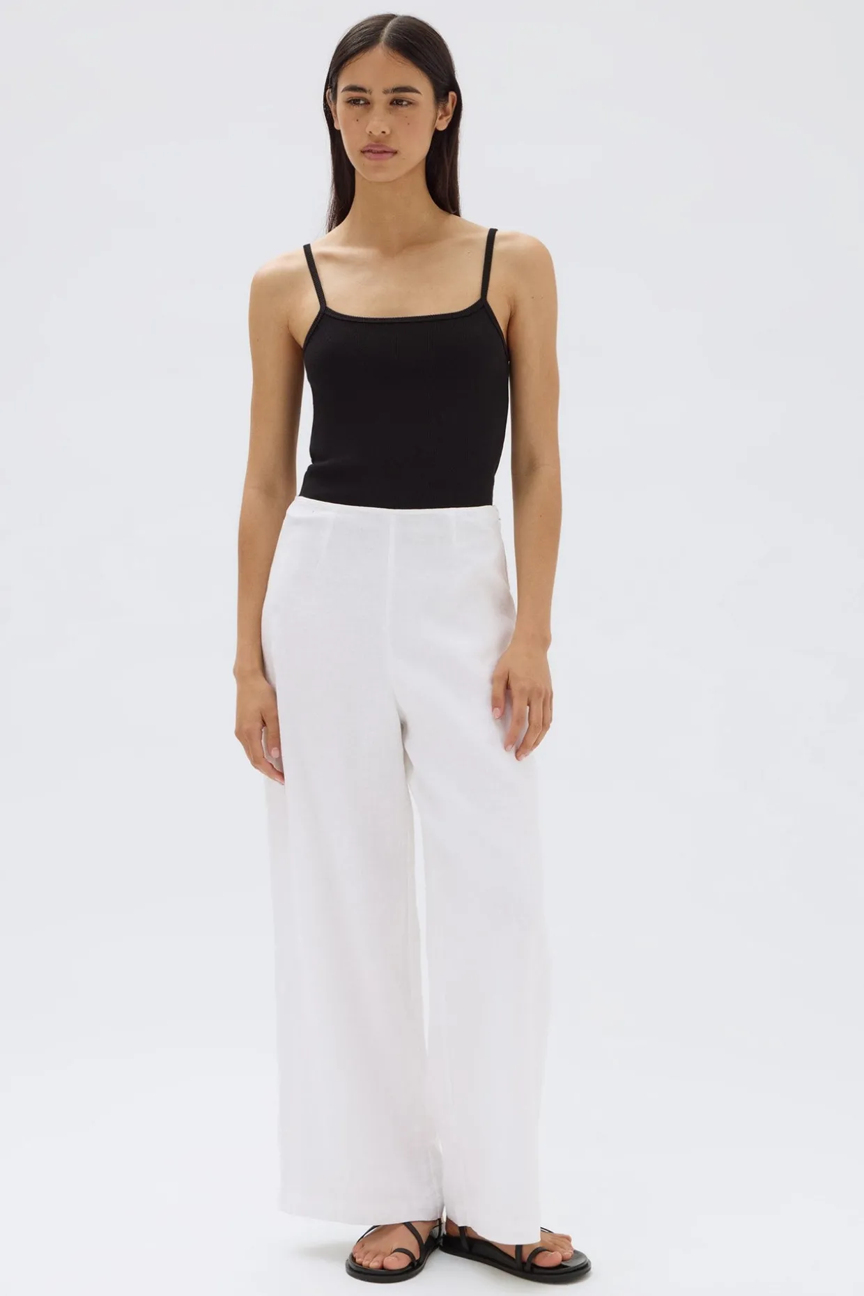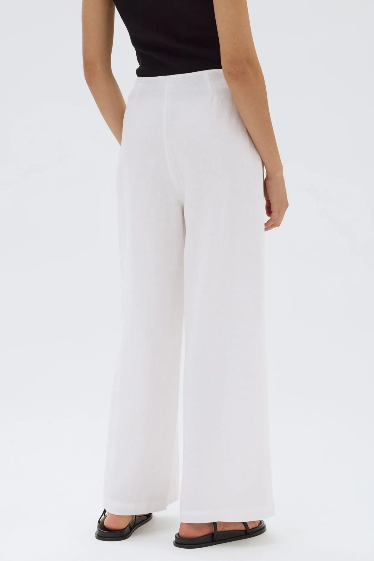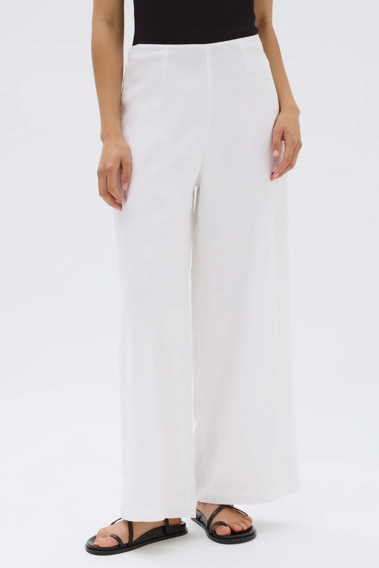 Wardrobe essential wide-leg linen pants featuring a bound waist and a side invisible zipper closure.