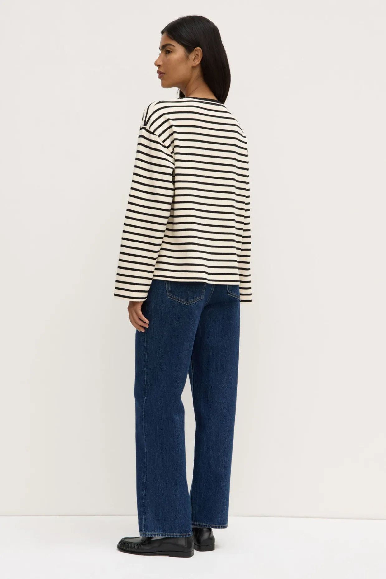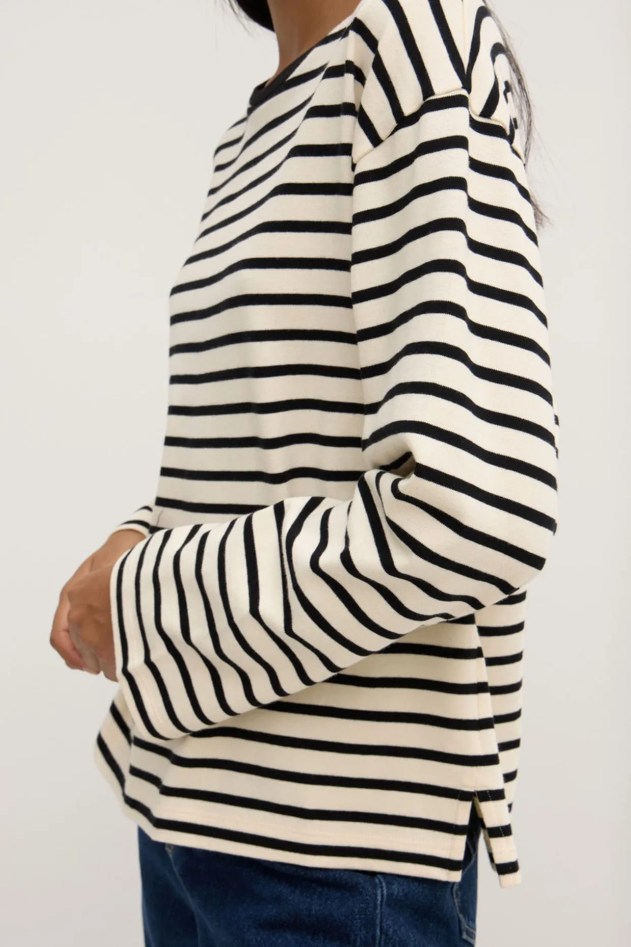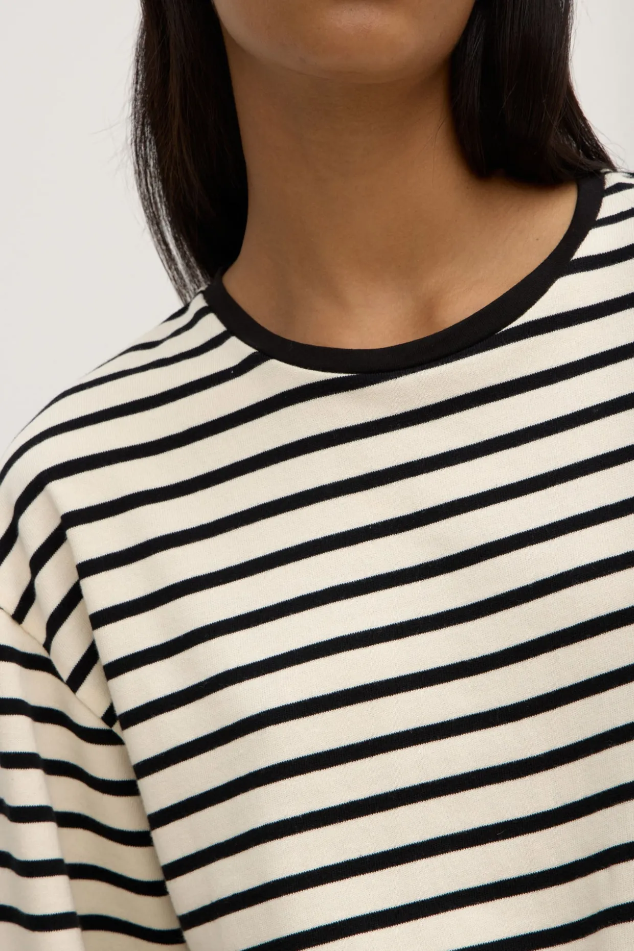 Lightweight long sleeve cotton jersey tee with striped design. Features a dropped shoulder and raglan sleeve for an effortlessly relaxed fit.