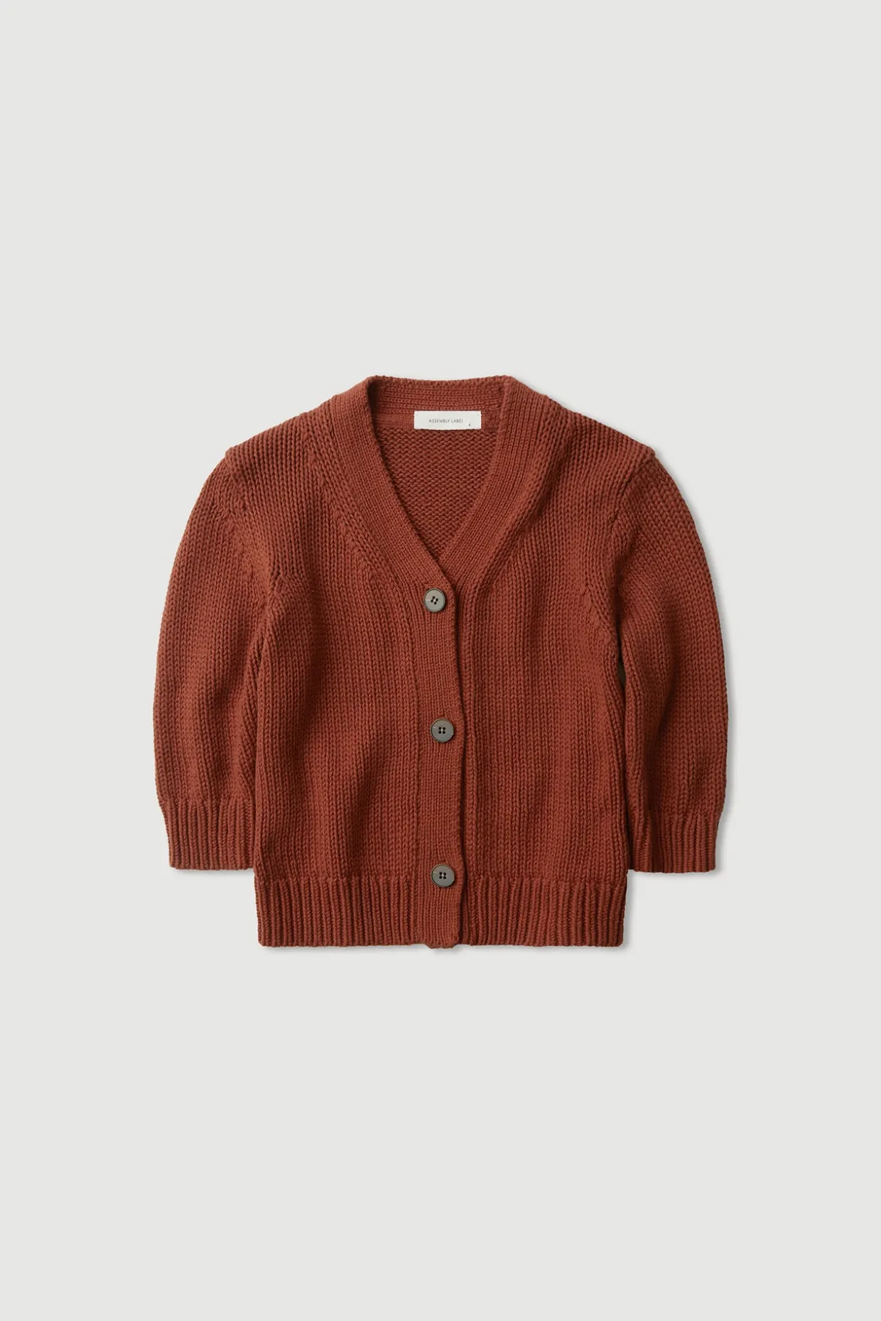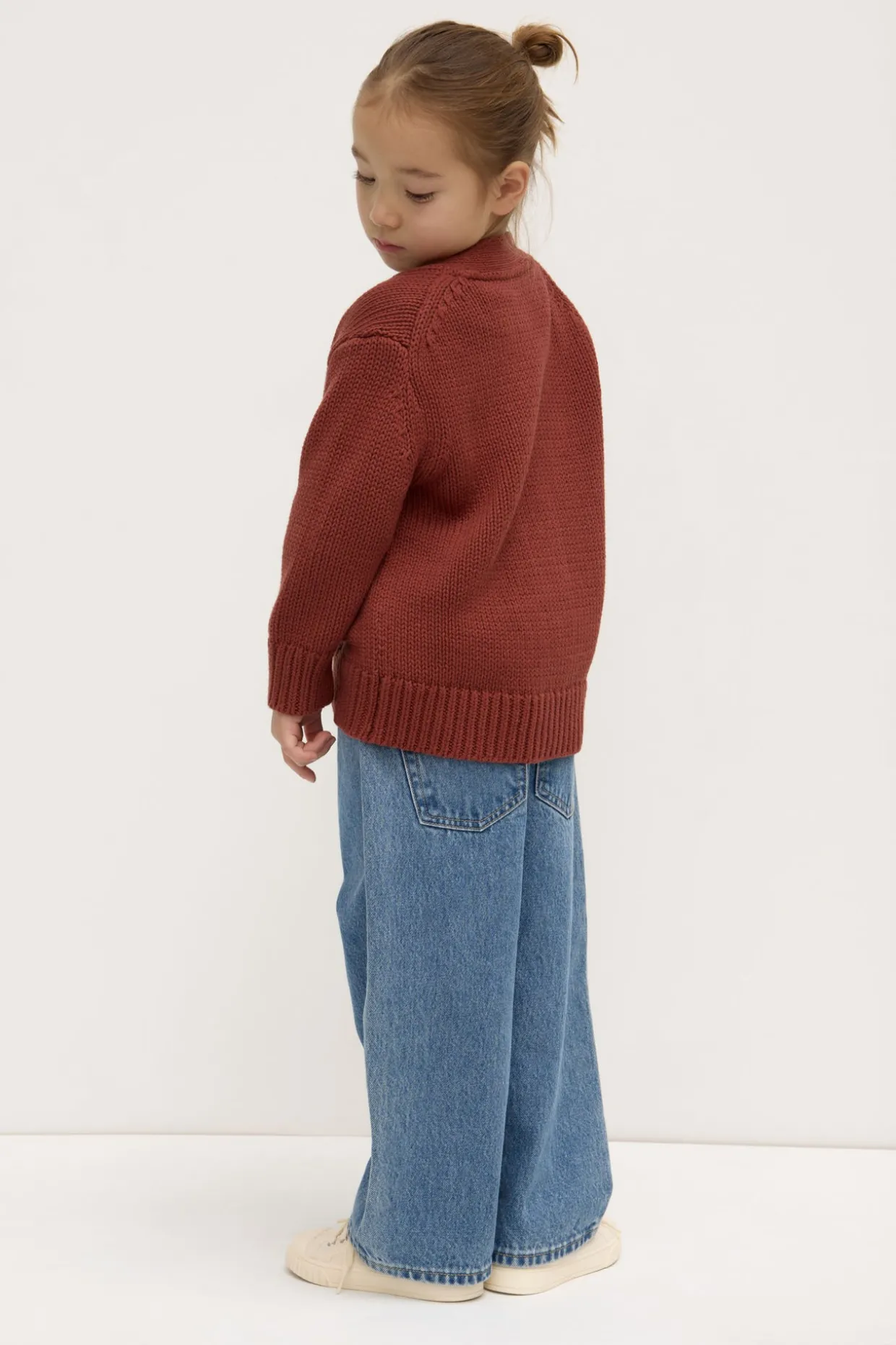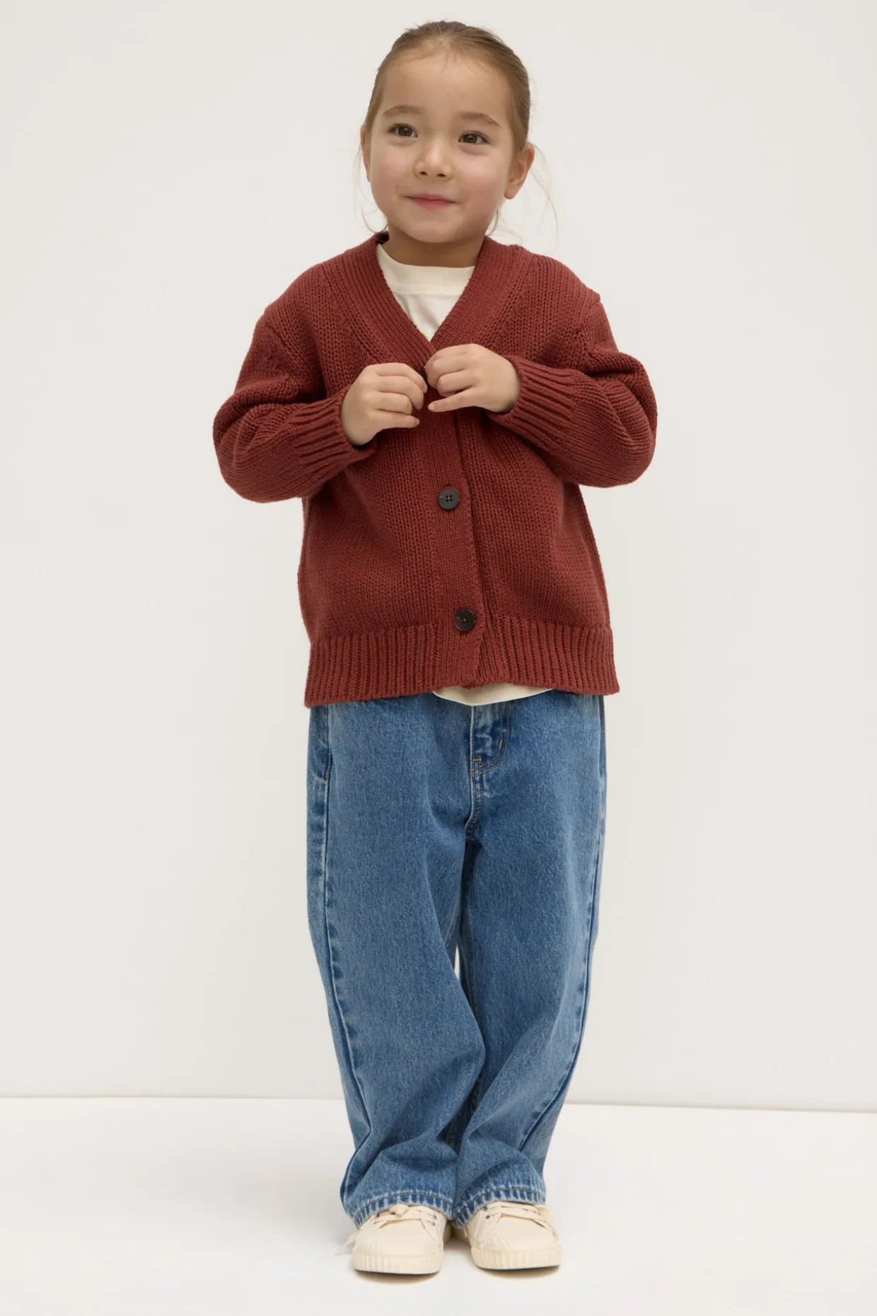 Relaxed fit kids cardigan knit featuring v-neckline and ribbed trims.