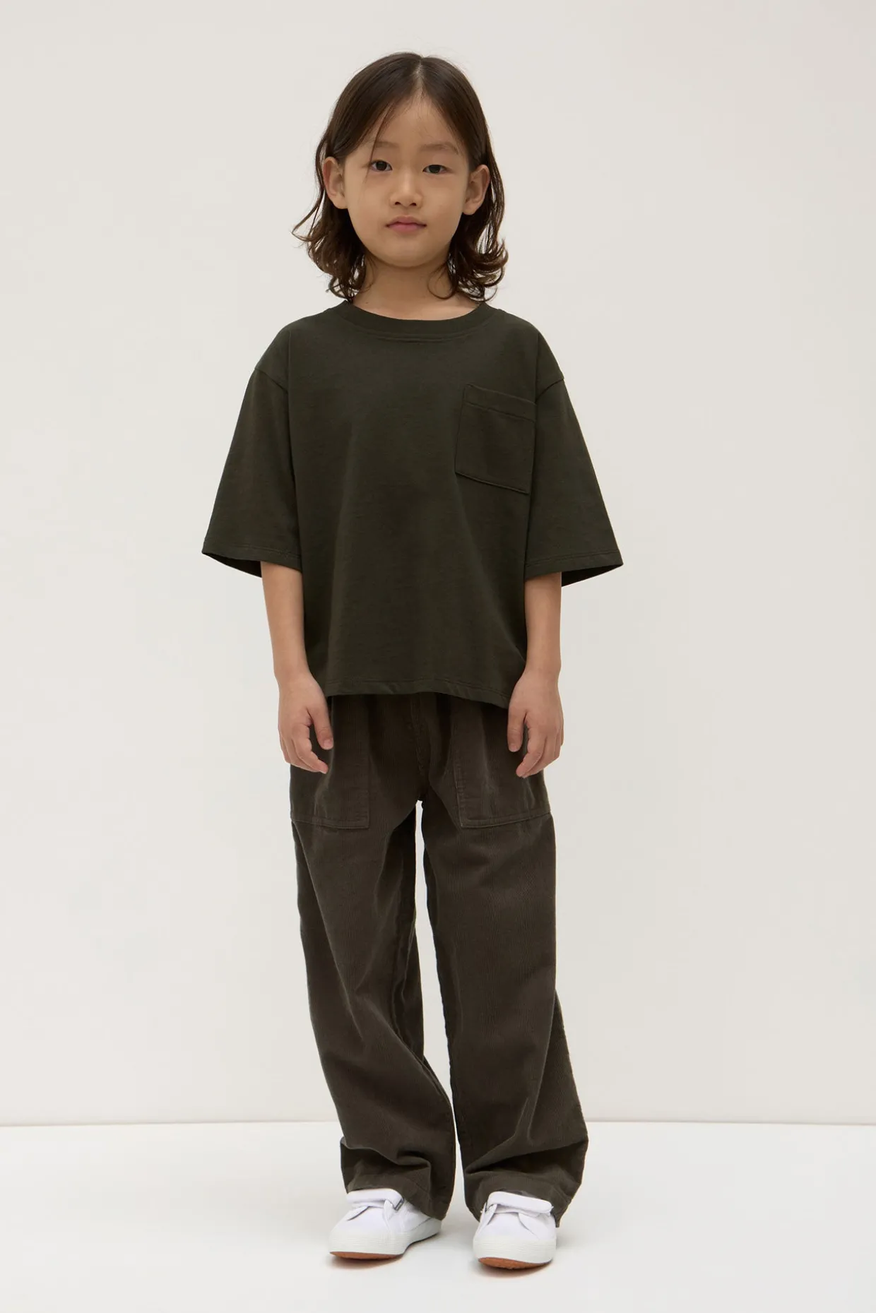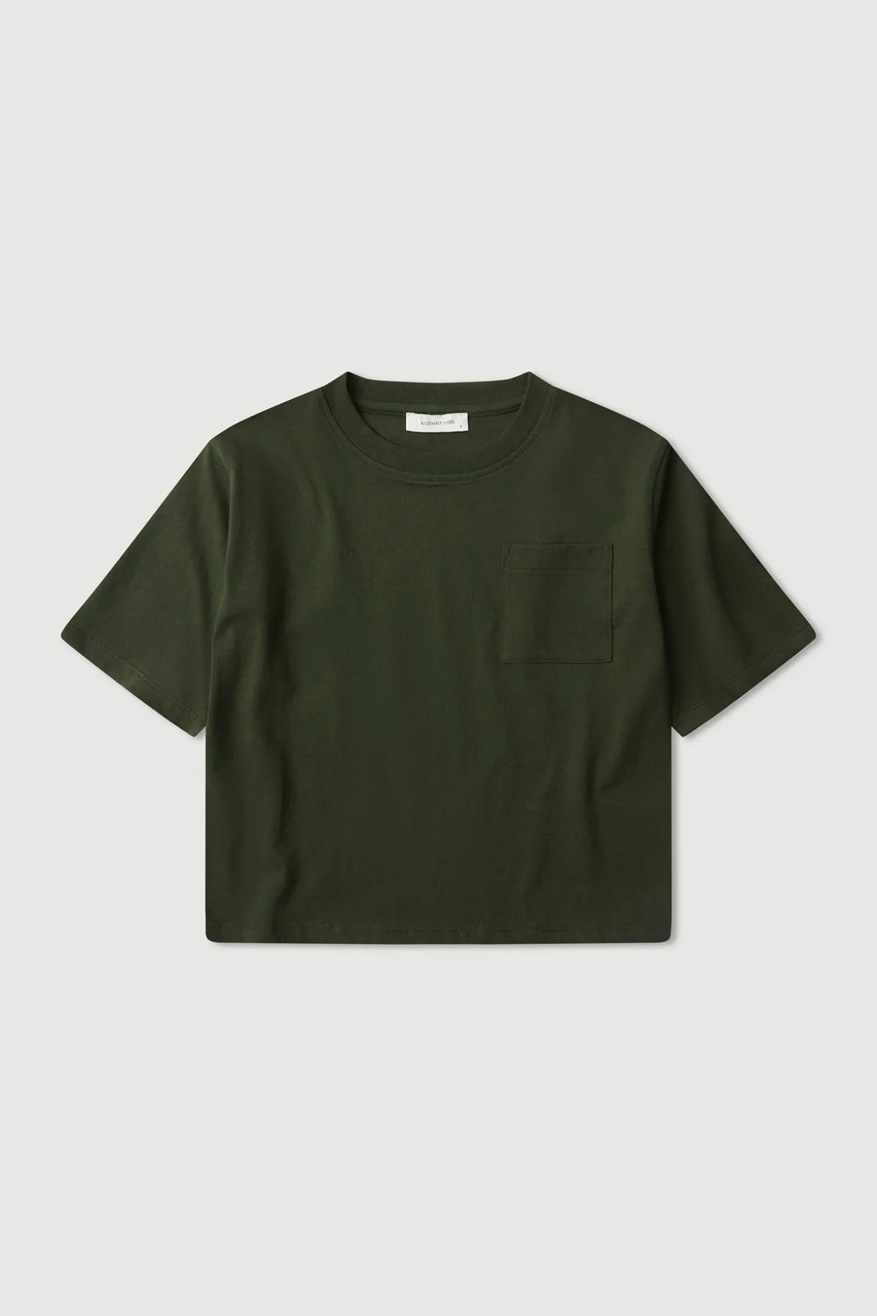 Boxy fit kids tee featuring a ribbed neckline and chest pocket detail.