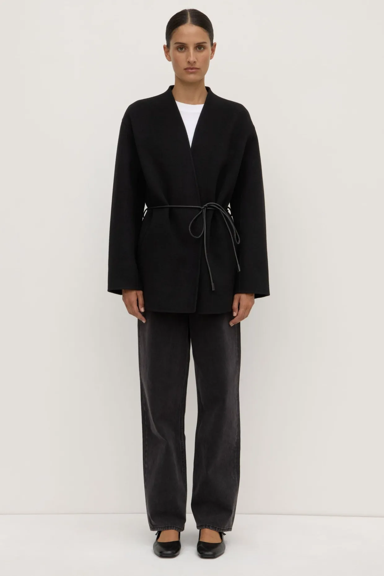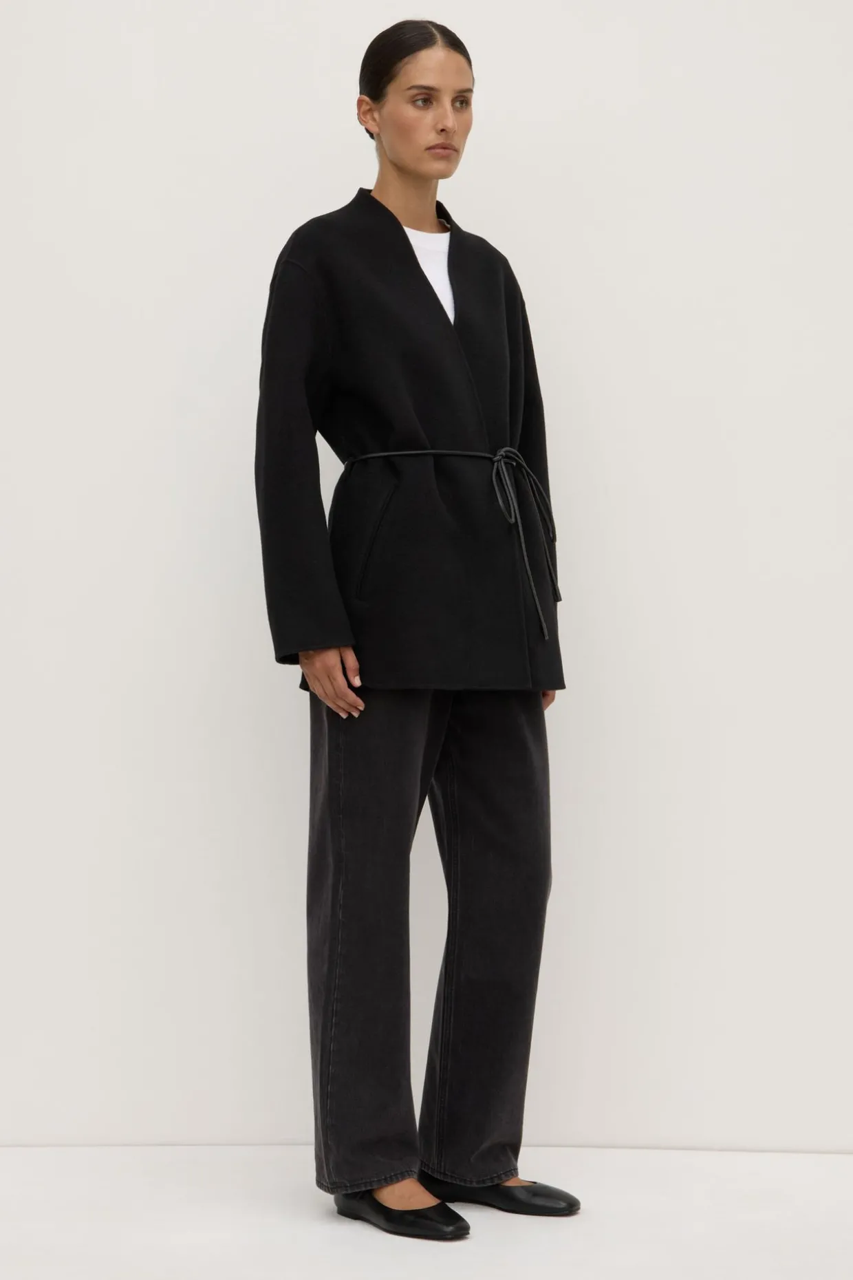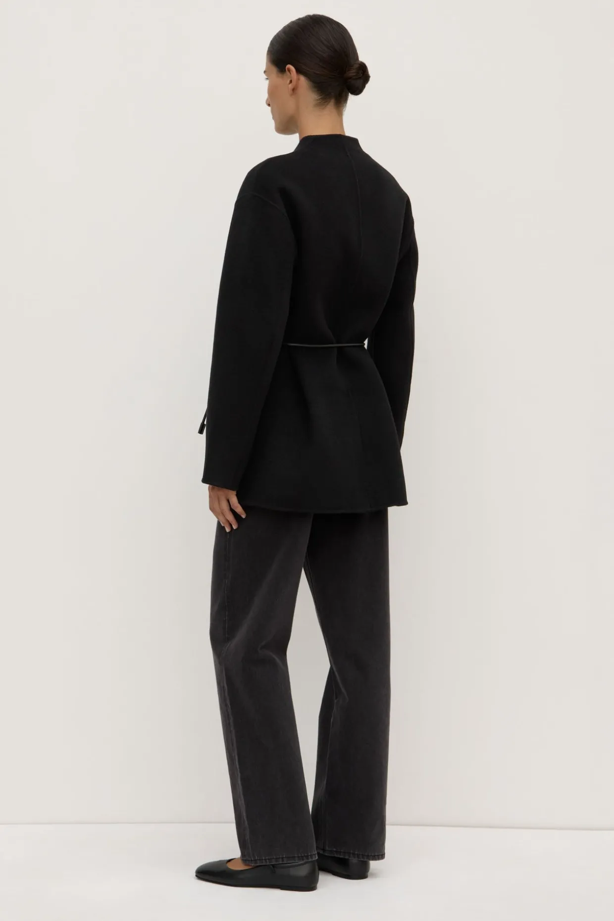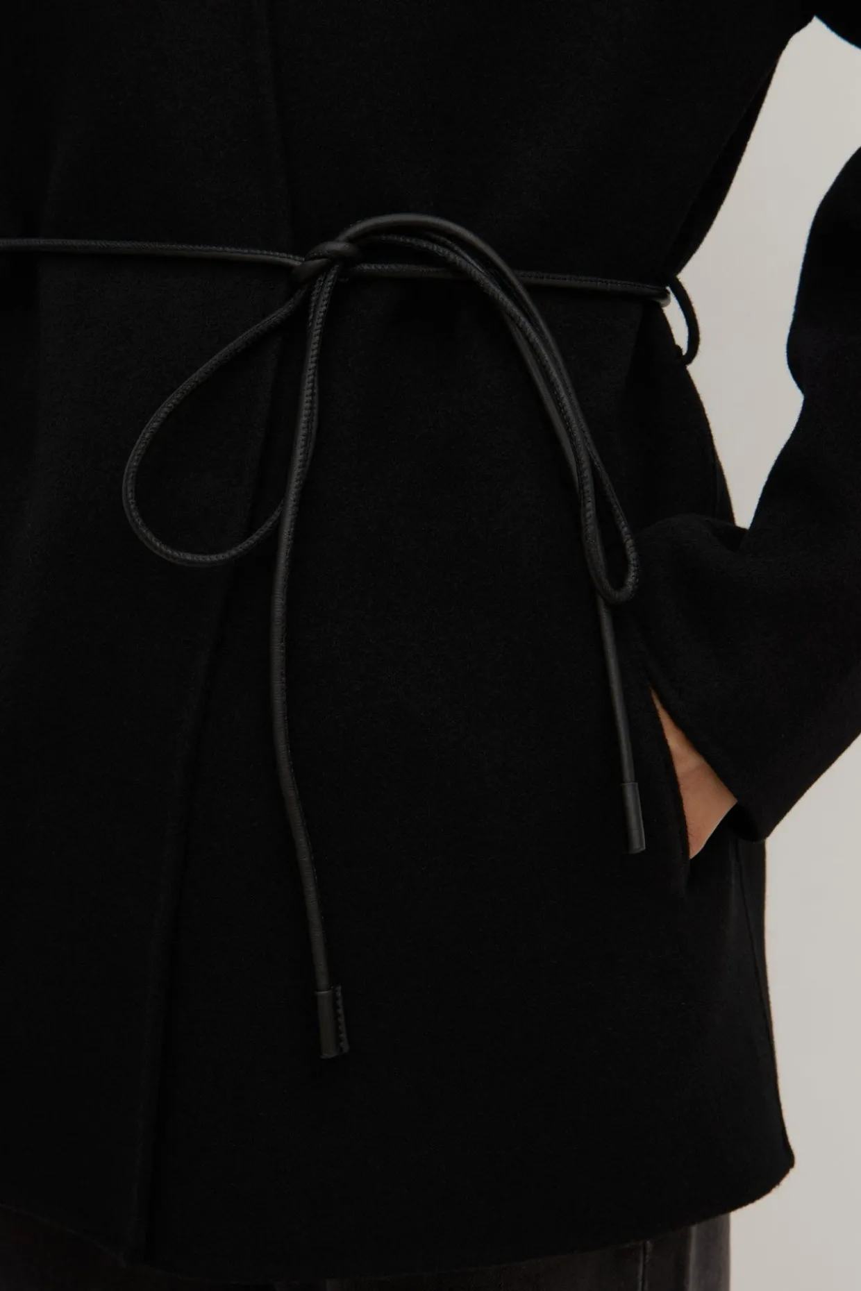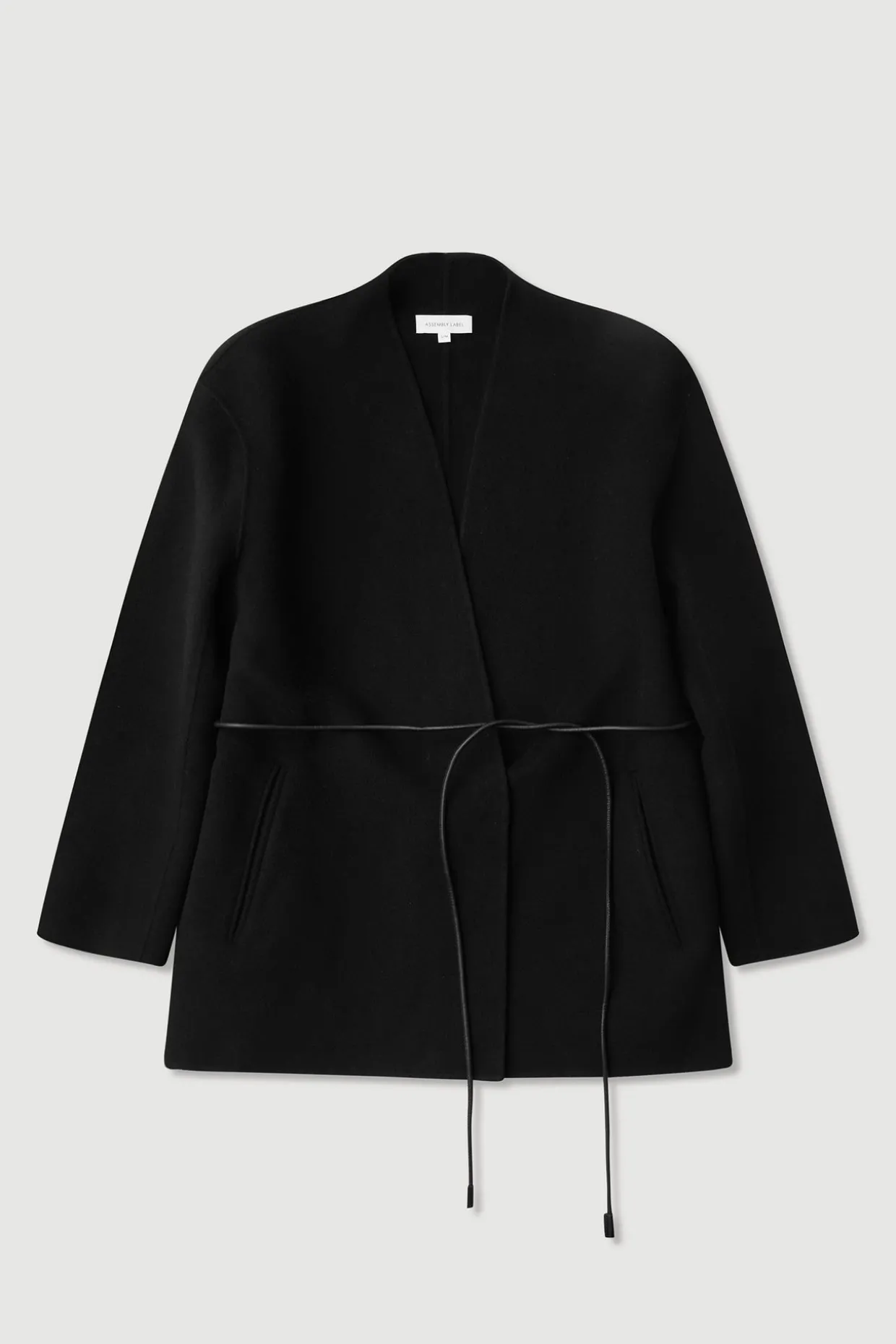 A cropped version of our Rhea Coat. This collarless jacket is crafted from 100% wool, featuring concealed snap metal closures and a 100% leather cord belt for versatile styling.